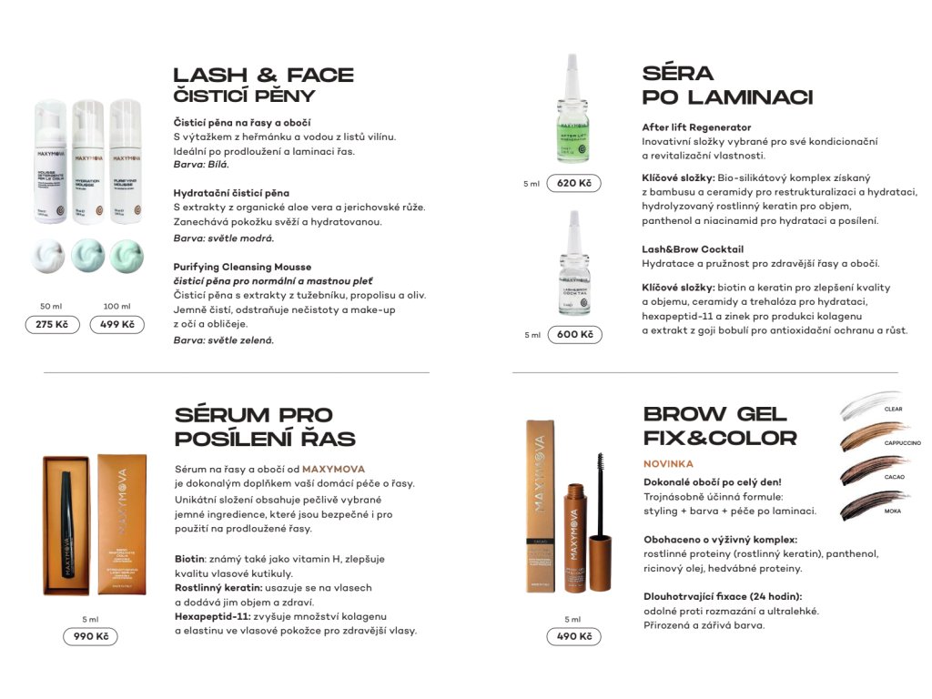 Medzi ikonické produkty MAXYMOVA patrí napríklad zlatá rada pre lash lifting – prvá na svete, ktorá obsahovala zlaté čiastočky pre atraktívnu prezentáciu na sociálnych sieťach, ďalej After Lift Regenerator, jeden z prvých vypĺňačov rias na trhu, či Amino Prep, špeciálny prípravok, ktorý regeneruje riasy pred lamináciou a zároveň urýchľuje prenikanie aktívnych zložiek.