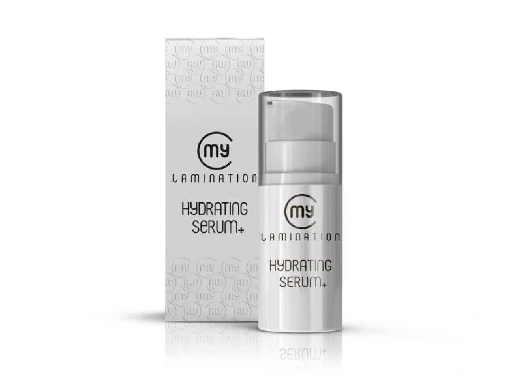 Hydrating serum+ sa musí použiť vždy na záver každej laminácie a lash liftingu s My Lamination, pretože ukončuje chemické procesy všetkých prípravkov použitých počas ošetrenia. Je určené na obočie a na riasy, ktoré vyživuje, čistí a uvoľňuje zo silikónovej natáčky. Obsahuje množstvo výživných a ošetrujúcich látok ako ricínový olej, žihľavu, slez, ibištekový kvet, aloe vera, glycerín, kolagén, panthenol, hydrolyzovaný hodváb a keratín. To všetko riasy a chĺpky posilňuje, hydratuje a zjemňuje. Sérum uzatvára kutikulu rias/chĺpkov a pomáha odstrániť z nich zvyšky laminačných prípravkov.