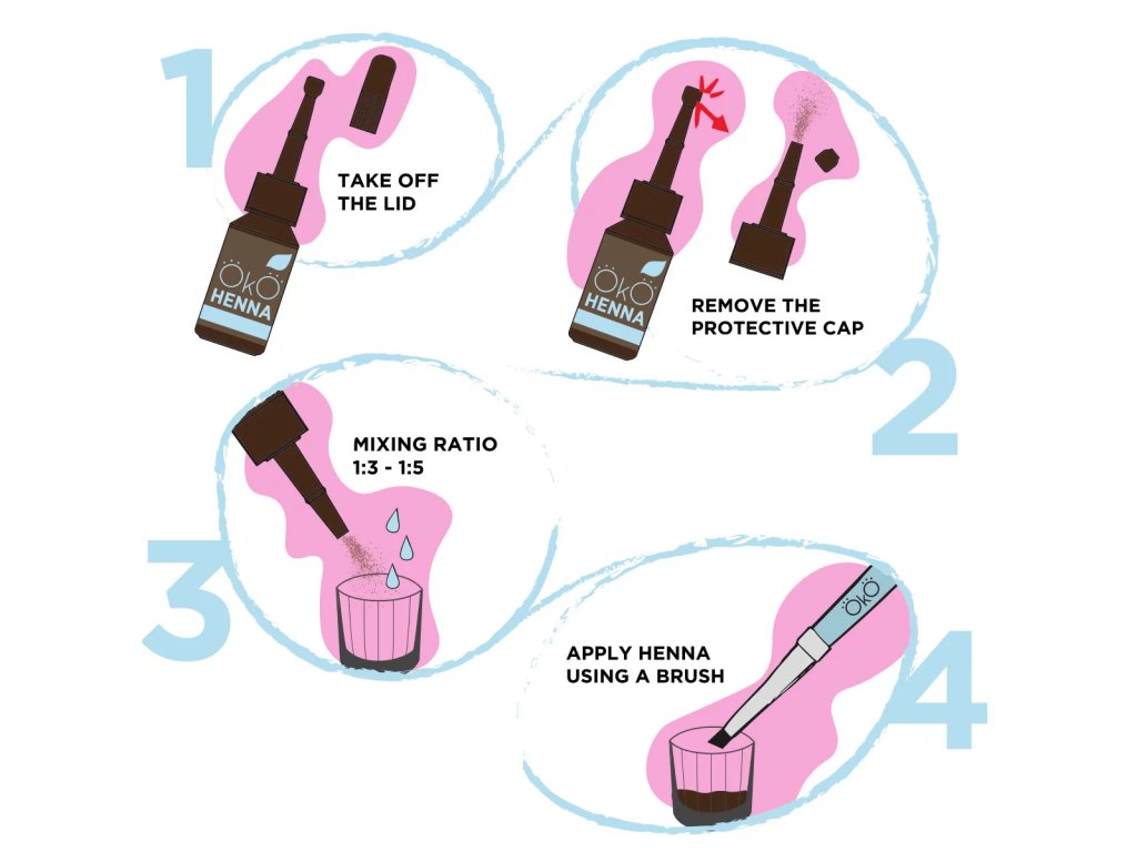 Zmiešajte OKO hennu s destilovanou vodou alebo minerálnym roztokom v pomere 1 diel henny k 3 dielom vody/roztoku (v závislosti na vybranej technike farbenia je možné použiť roztok v pomere 1:5). Dôkladne premiešajte zmes, kým sa úplne nerozpustí. Výsledná konzistencia by mala pripomínať sójovú omáčku. Používajte nerezovú nádobu
